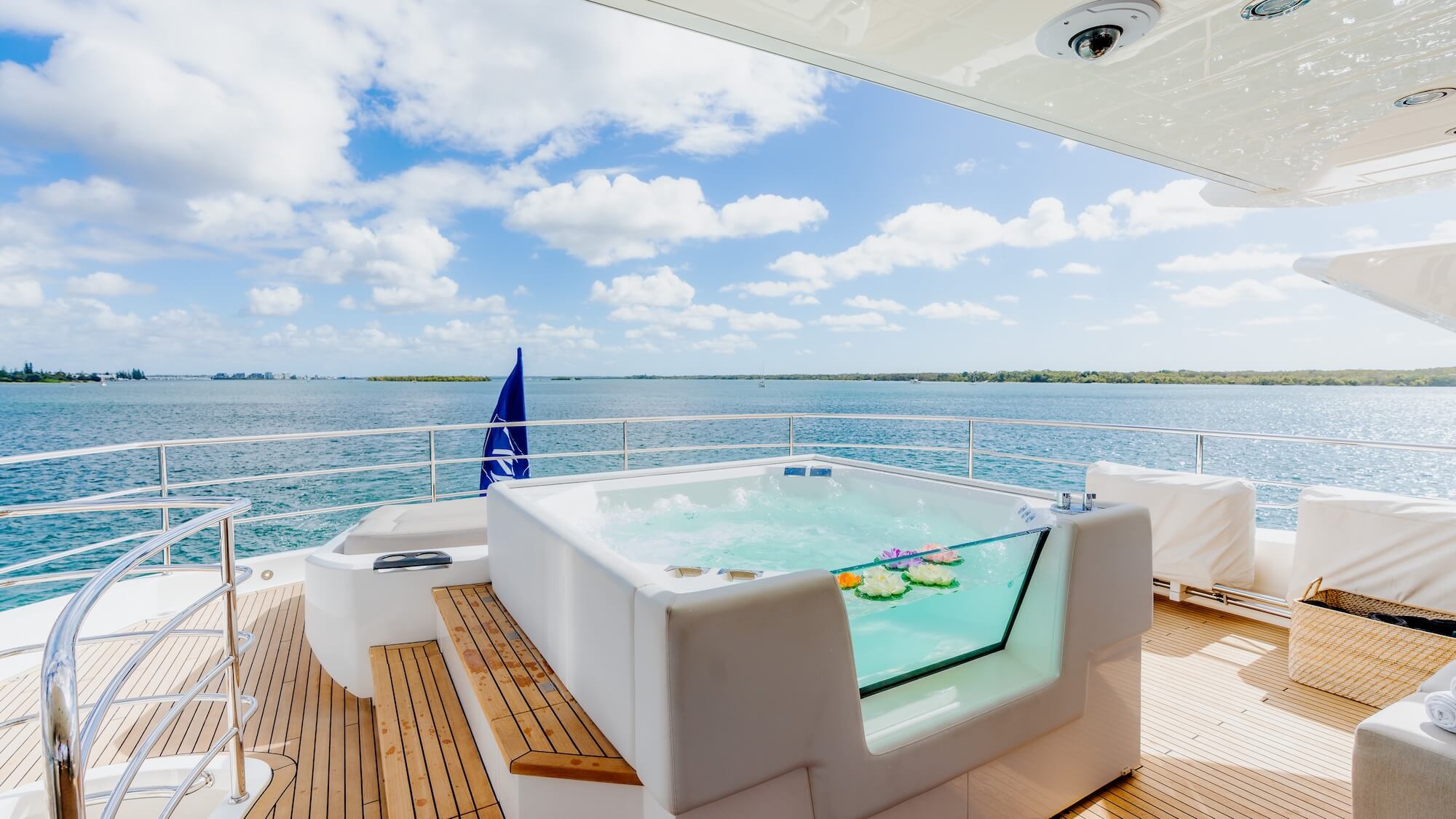 Sunset's exterior spaces are designed to make the most of time outdoors. The sundeck features a jacuzzi surrounded by sun lounges, while multiple deck areas provide options for dining, relaxing, or taking in the views underway. Her sporty Sunseeker design allows for smooth cruising along the coastline, with easy access to the water from the aft platform.