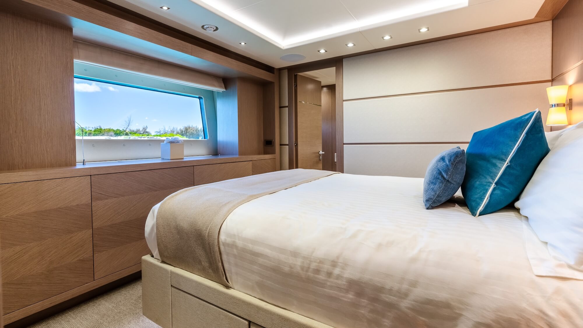 Sunset accommodates up to 10 guests across five cabins, including a full-beam master suite. The layout is well suited to families or groups, offering a mix of double and twin cabins, each with its own ensuite. The overall arrangement provides both comfort and privacy for guests throughout the charter.